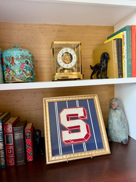 Vintage Large Varsity Initial Letter "S" on Navy White Striped Fabric in Gold Frame