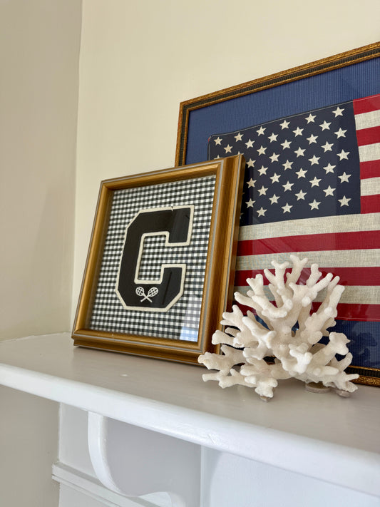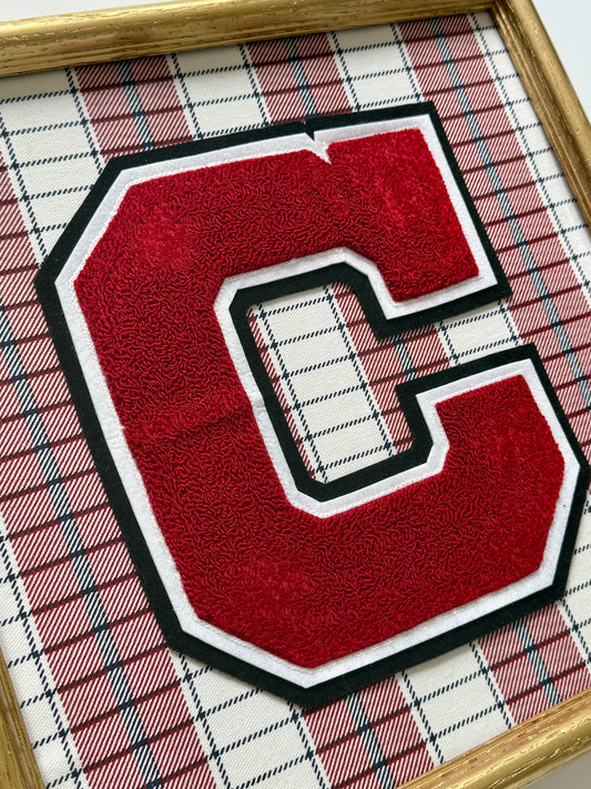 Vintage Large Varsity Initial Letter "C" on Red White Blue Plaid Fabric in Gold Frame