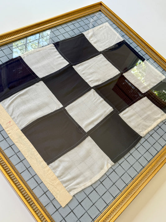 Vintage Large Nautical Checkered Signal Flag "N" on Blue Windowpane Fabric in Gold Frame