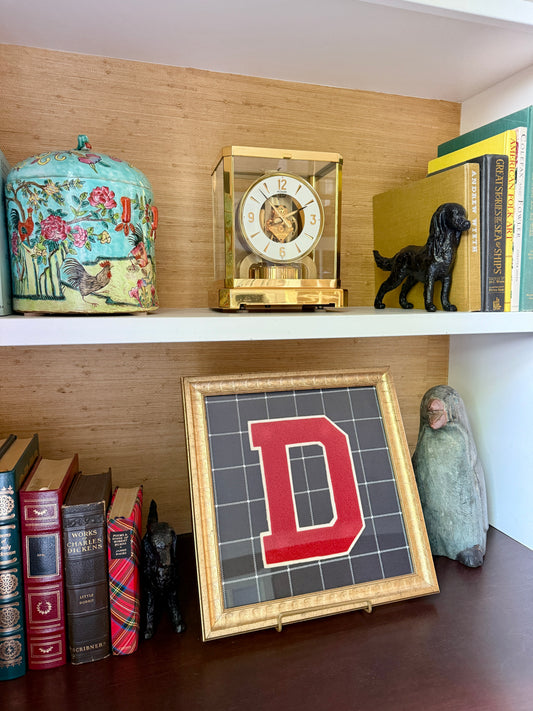 Vintage Large Varsity Initial Letter "D" on Navy Blue Windowpane Fabric in Gold Frame