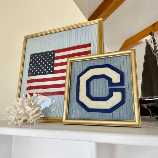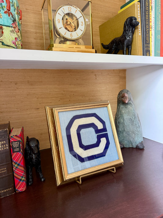 Vintage Large Varsity Initial Letter "C" on Blue Striped Fabric in Gold Frame