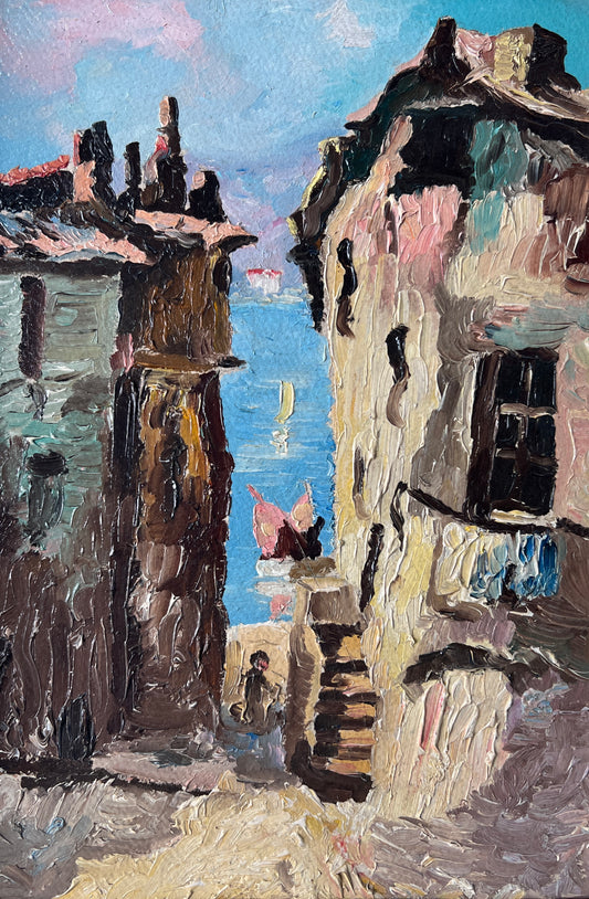 Vintage Le Touquet France Coastal Town Impasto Oil Painting in Cream Frame