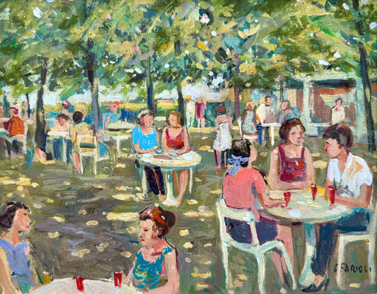 Vintage Lunch in Southampton Cafe Scene Oil Painting in Gold Frame