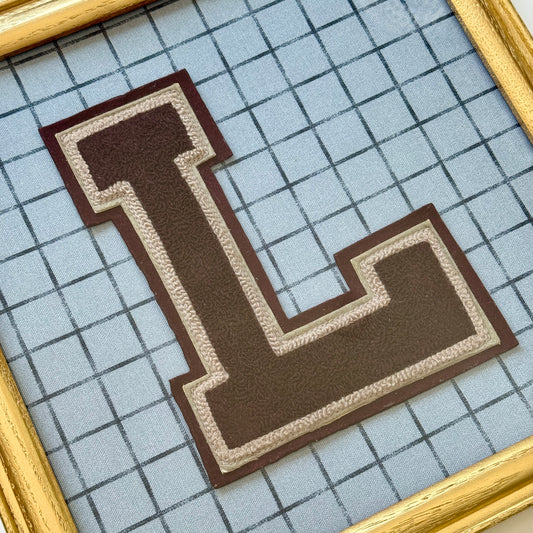 Vintage Large Varsity Initial Letter "L" on Blue Windowpane Fabric in Gold Frame
