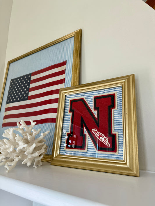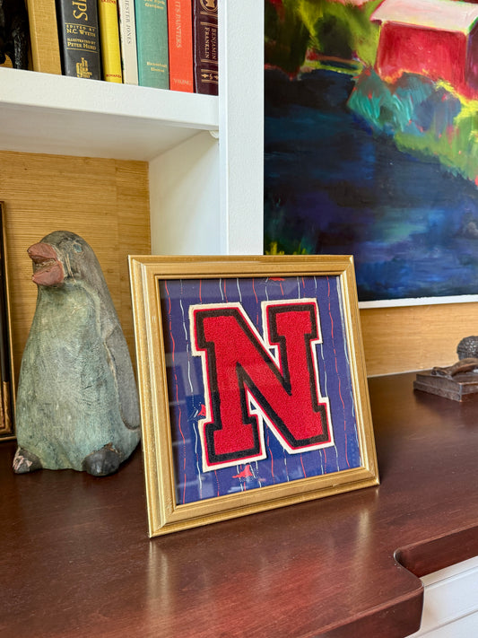 Vintage Large Varsity Initial Letter "N" on Navy Blue Regatta Fabric in Gold Frame