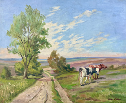 Vintage Large Impressionist Summer Landscape Oil Painting With Cows in Gold Frame