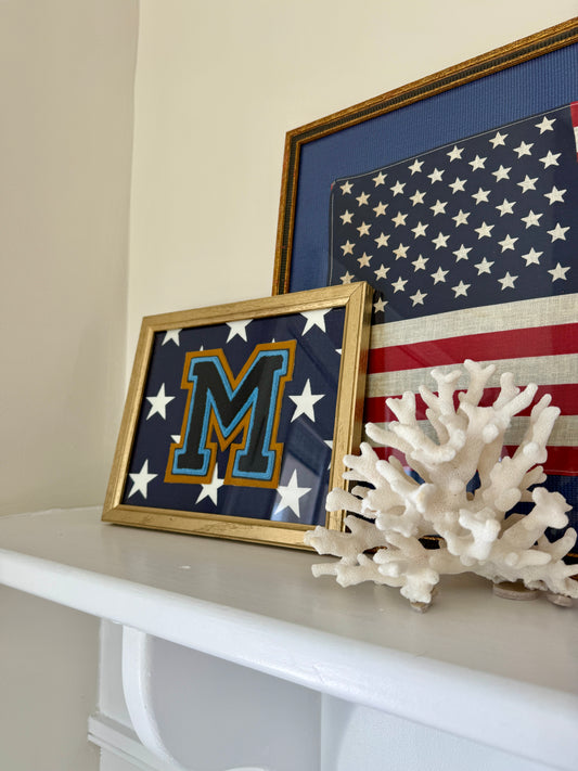 Vintage Large Varsity Initial Letter "M" on Blue Star Fabric in Gold Frame