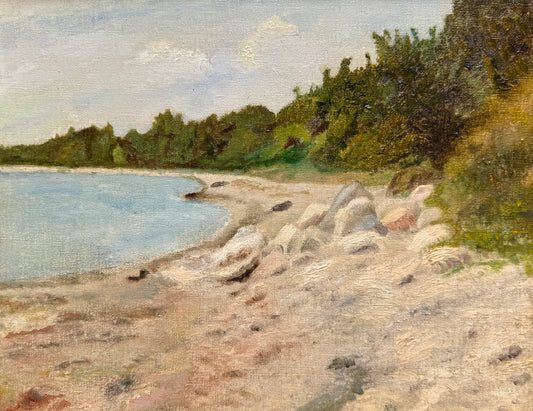 Vintage Wooded Coastal Landscape Oil Painting in Scalloped Gold Frame