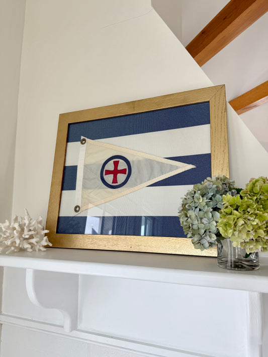 Vintage Yachting Burgee on Navy White Awning Stripe in Gold Frame