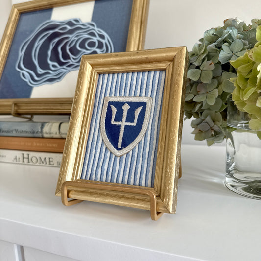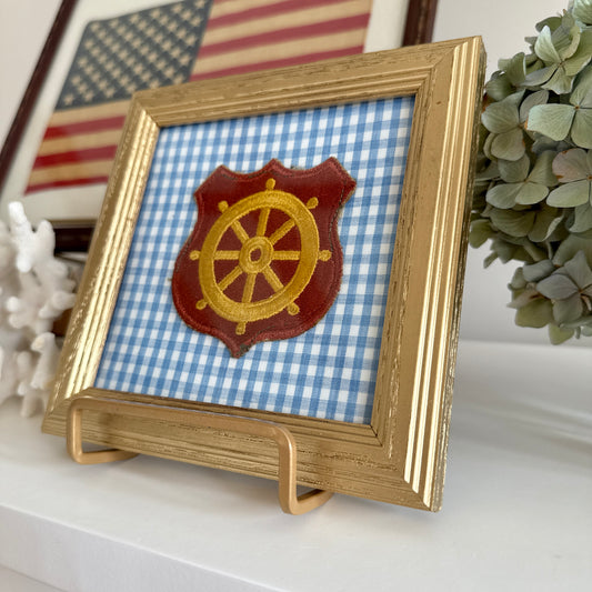 Vintage World War II US Military Port of Embarkation Ship Wheel Patch on Blue Gingham in Gold Frame