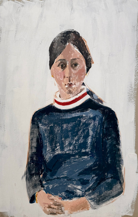 Vintage Young Girl in Blue Modernist Portrait Oil Painting in Natural Wood Frame
