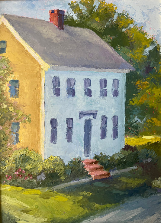 Vintage Yellow House on Main Street Impressionist Oil Painting in Gold Frame
