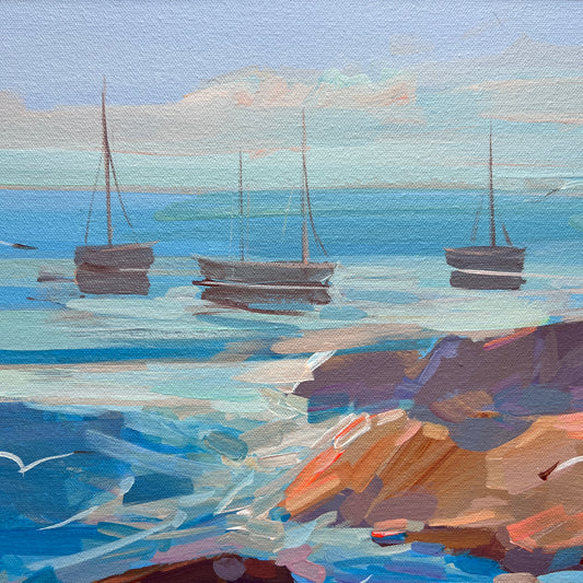 Vlad Yakerson Coloful Coastal Painting on Canvas Sailboats in Cove in Gold Frame