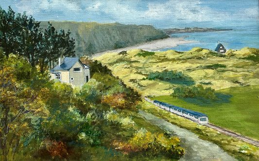 Vintage Welsh Oceanside Green Landscape with Train in Wood and Gold Frame
