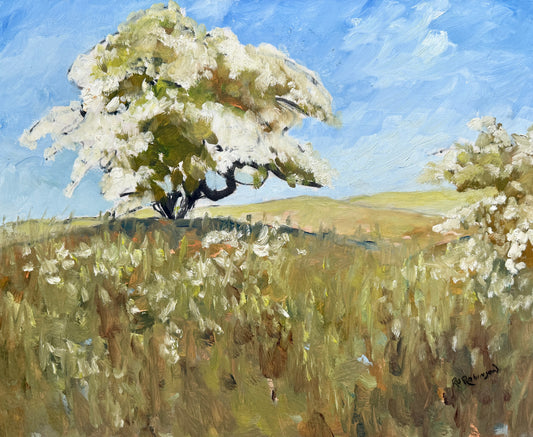 Vintage Vibrant Spring Meadow Oil Painting in Wood Frame