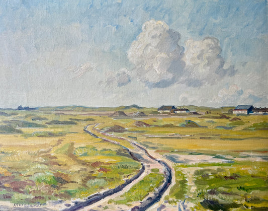 Vintage Walk in the Countryside Landscape Oil Painting in Wood Frame