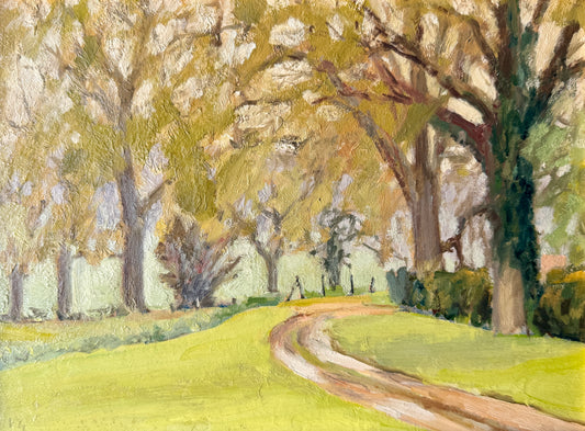 Vita Gollancz High Hall Tree Lined Country Driveway Oil Painting in Gold Frame