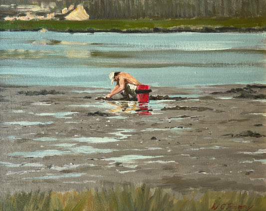W. Perry New England Clamdigger Coastal Landscape Oil Painting in Gold Frame