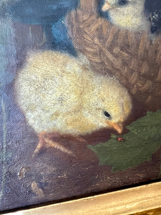 19th Century Family of Chicks in Basket with Ladybug Oil Painting in Original Gold Frame