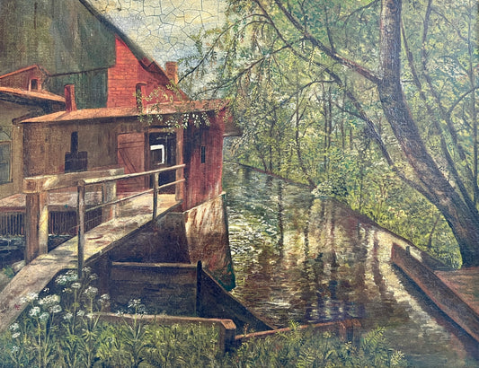 19th Century Riverside Red Barn Landscape Oil Painting in Original Frame