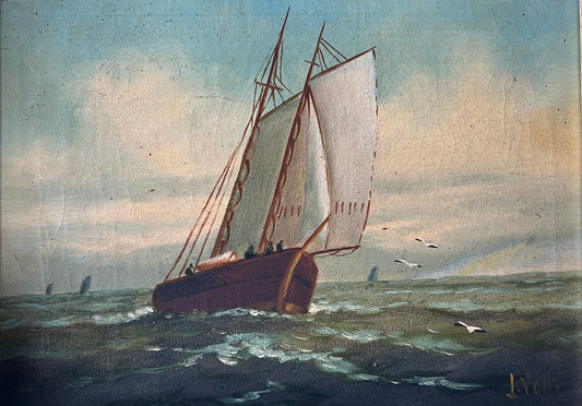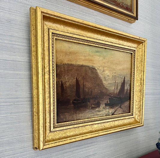 19th Century Sailboat Under Blue Skies Oil Painting in Original Gold Frame
