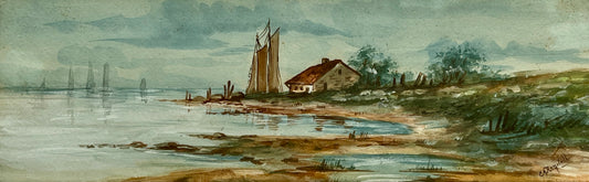 19th Century Sailboats and Sea Cottage Seascape Watercolor Painting in Gold Frame