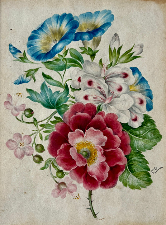 19th Century Intricate Floral Watercolor Painting in Gold Frame