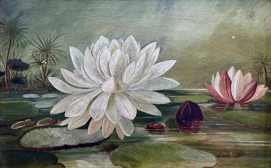 19th Century Lily Pads and Water Lilies Oil Painting in Gold Frame