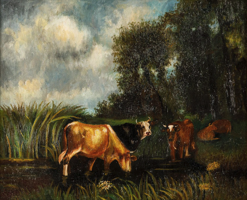 19th Century Pastoral Country Landscape with Cows Oil Painting in Ornate Gold Frame