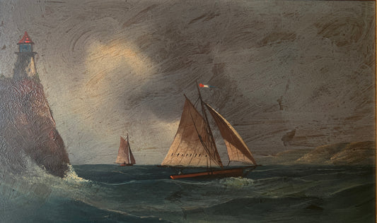 19th Century French Seascape of Sailboats Approaching a Lighthouse in Gold Frame