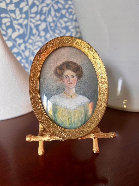 19th Century Miniature Pastel Portrait of Young Woman in Oval Gold Frame