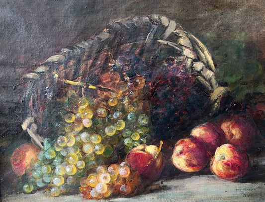 19th Century Parisian Still Life Oil Painting of Grapes and Peaches in Basket in Gold Frame