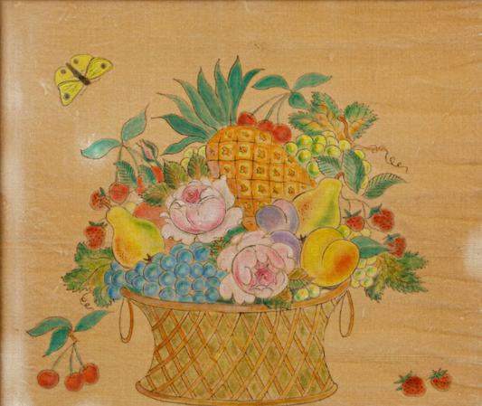 19th Century Oil on Velvet Theorem Fruit Basket with Butterfly in Gold Frame