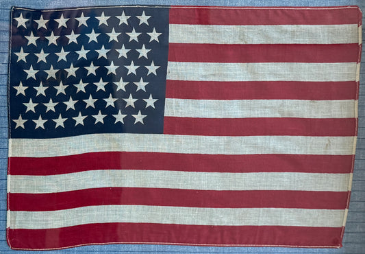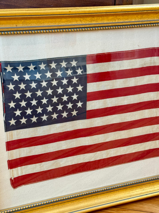 Old, 48 Star American Flag on Dark Chambray in Vintage Gold Wood Frame