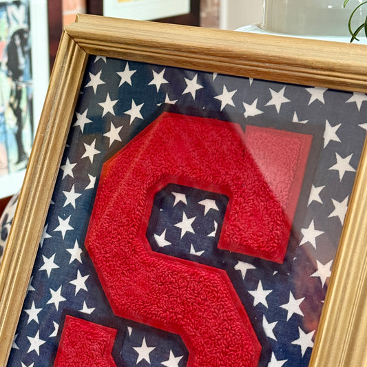 Vintage Varsity Letter Initial S on Red White Blue Stars in Gold Frame