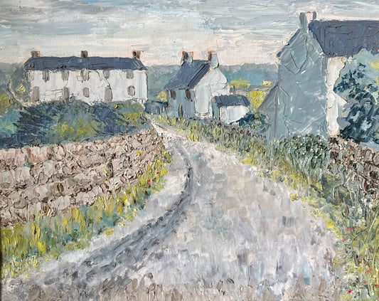 Vintage English Countryside Blue Green Landscape Oil Painting in Celtic Gold Frame