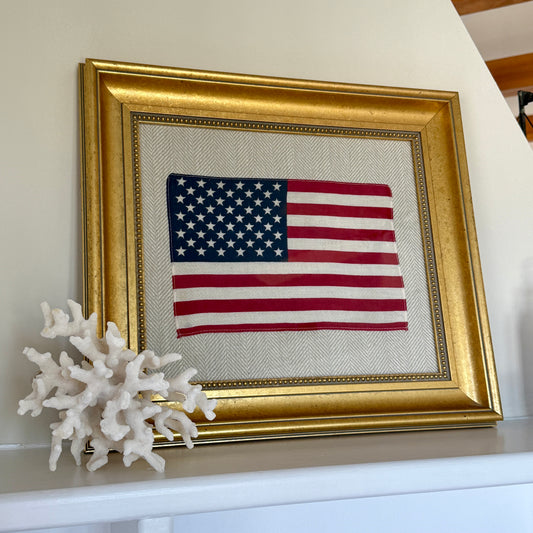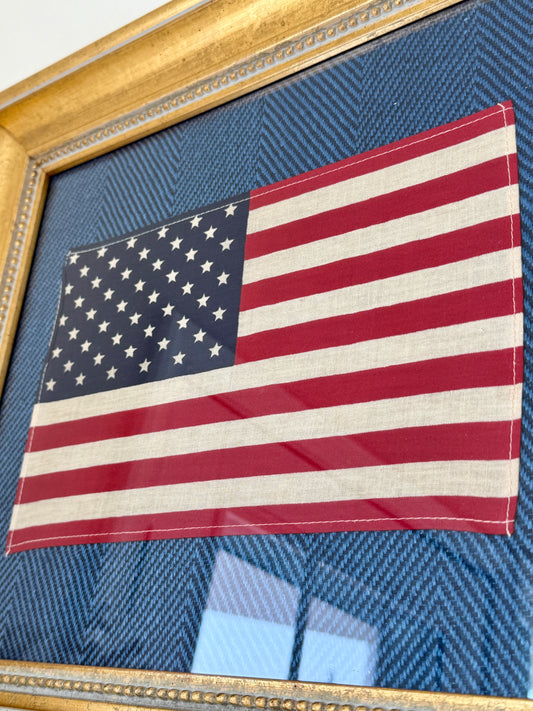 Vintage 50 Staggered Star American Flag on Ralph Lauren Navy Heringbone in Gold Frame