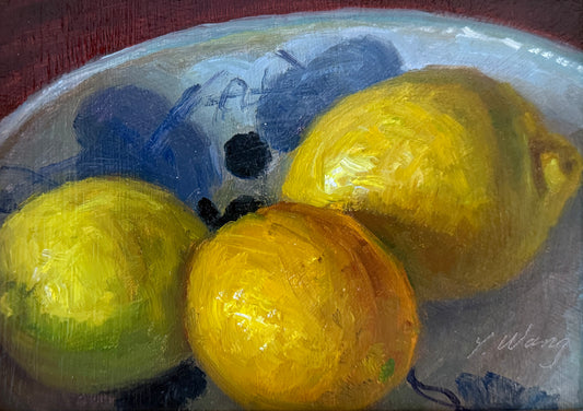 Blue and White Bowl with Lemons Contemporary Still Life Oil Painting in Gold Frame