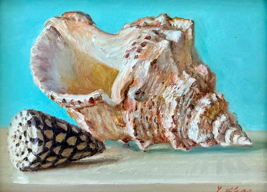 Summer Brights Conch and Cone Shell Still Life Oil Painting in Gold Frame