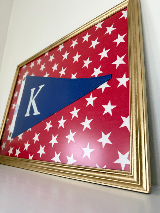 Vintage "K" Initial Canvas Burgee Nautical Flag on Red White Stars in Gold Frame