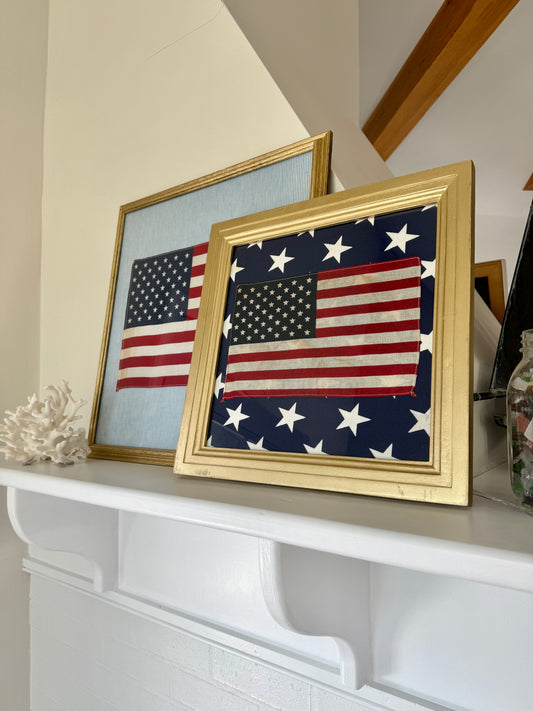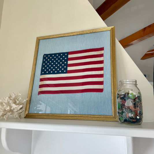 Vintage 50 Staggered Star American Flag on Blue Ticking Stripe Fabric in Gold Frame
