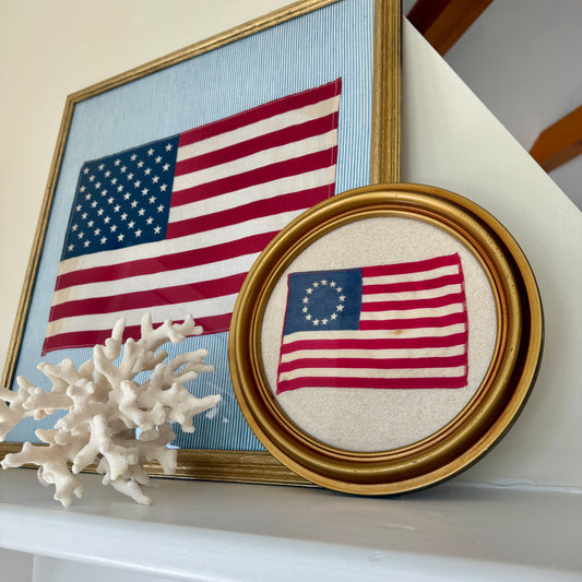 Vintage 13 Star American Betsy Ross Parade Flag on Ivory Herringbone in Gold Round Frame