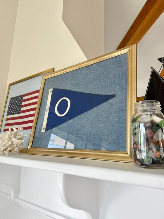 Vintage "O" Burgee Nautical Flag on Blue Chambray Fabric in Gold Frame