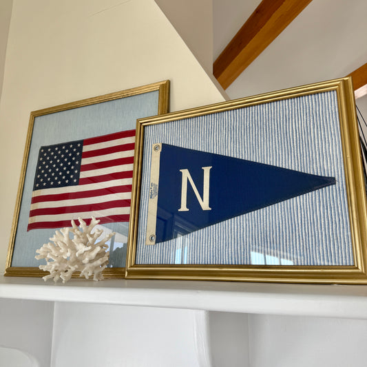 Vintage "N" Burgee Nautical Flag on Blue Wavy Striped Fabric in Gold Frame