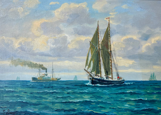 Frants George Carl Landt Sailboat and Steamship in Seascape Oil Painting in Laurel Leaf Gold Frame