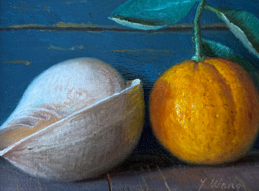 Seashell and Clementine Realist Still Life Oil Painting in Gold Frame