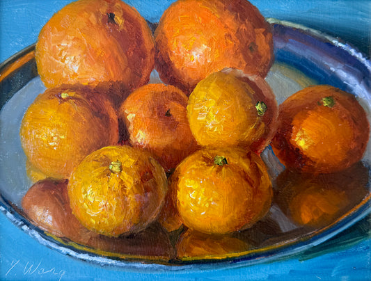 Oranges and Clementines on a Silver Platter Realist Still Life Oil Painting in Gold Frame