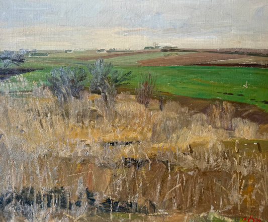 Vintage Impressionist Summer Hayfield Landscape Oil Painting in Gold Frame