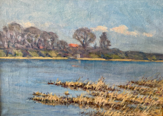 Vintage Riverside Landscape Oil Painting in Gold Frame