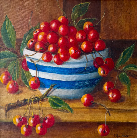 Patricia Newman Cherries in Cornishware Bowl Still Life Oil Painting in White Wood Frame